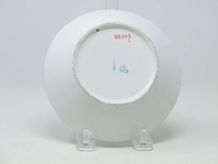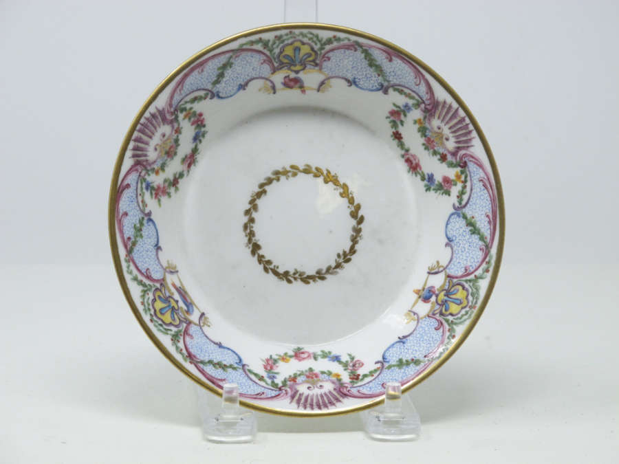 Marks: Sevres mark of 1770, R between two L's and Evans' mark (a sword) in underglaze blue on bottom of cup and saucer.