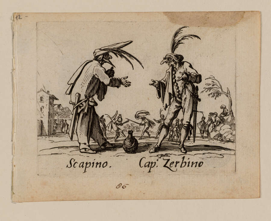 Original--Recto:in brown ink, LC:85; in pencil, UL:12- In Plate--In LL:Scapino.; in LR:Cap. Zerbino