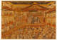 This perspective picture (uki-e) is based upon a modified version of the Western system of one-point perspective. It depicts the interior of the Nakamura Theater, one of the most famous and enduring kabuki theaters in Edo (modern Tokyo). The heroine of the play, an angry spirit disguised as a temple dancer (shirabyoshi), is entering from the left on the raised walkway. The monk who has rejected her advances is hiding under the bell, where he will be burned to death after she performs her dance, turns into a serpent, and breathes fire on the bell. The scene is from “Suehiro Soga, a Myriad of Birds: The Maiden of Dojo Temple,” which is part of the play Sazareishi Hirogenji. This 1744 performance was among the cycle of plays that celebrated the New Year.