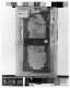 • Closeup showing the metal clasps of a brown wooden frame which secures the structure. Faint, curving handwriting runs across the surface of the wood.