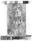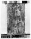 • Closeup of the center support of a wooden frame whose aged surface features faded red markings.  Above and below, two rounded triangular wedges also visible.
