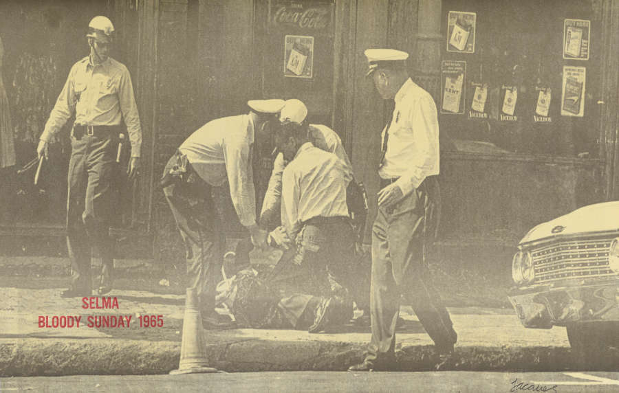 On recto, “SELMA / BLOODY SUNDAY 1965” printed in red ink LL and signed “Jacques” in graphite LR.