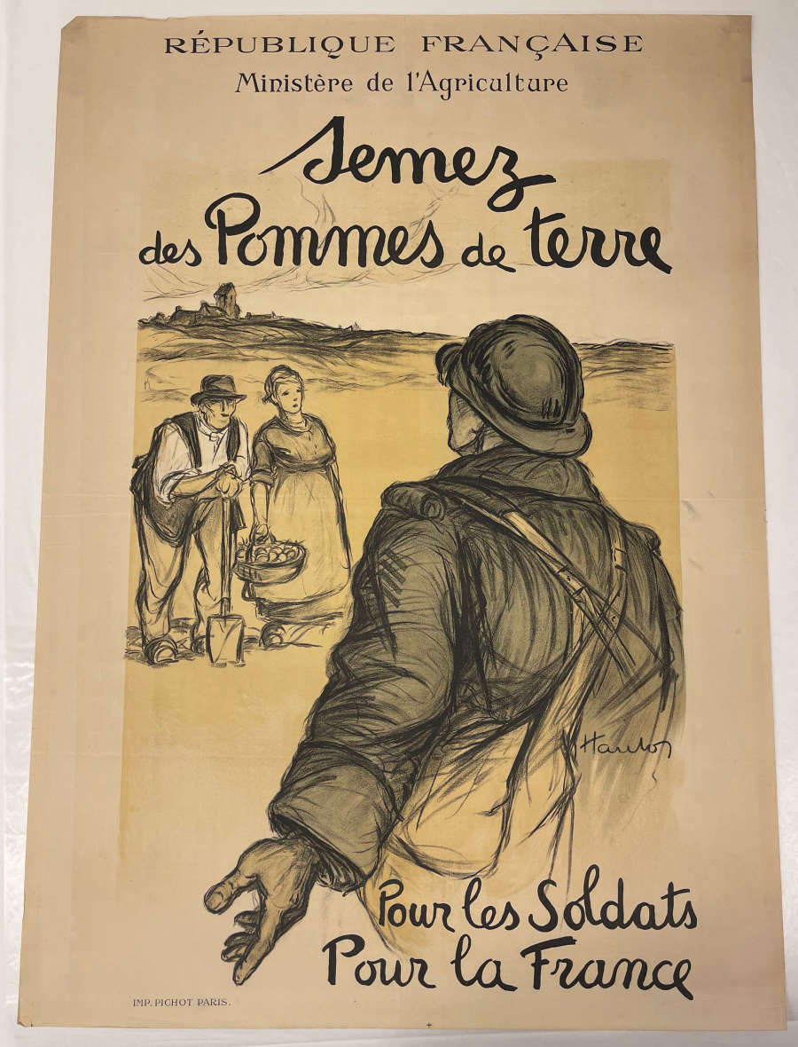 title lithographed in upper and lower image: Semez / des Pommes de terre / Pour les Soldats / Pour la France; artist signed in stone in LR quadrant of image: (illegible - possibly Havlon); lithographed above title: REPUBLIQUE FRANCAIS / Ministere de l'Agriculture; printer name printed in LL quadrant of image: IMP.PICHOT PARIS