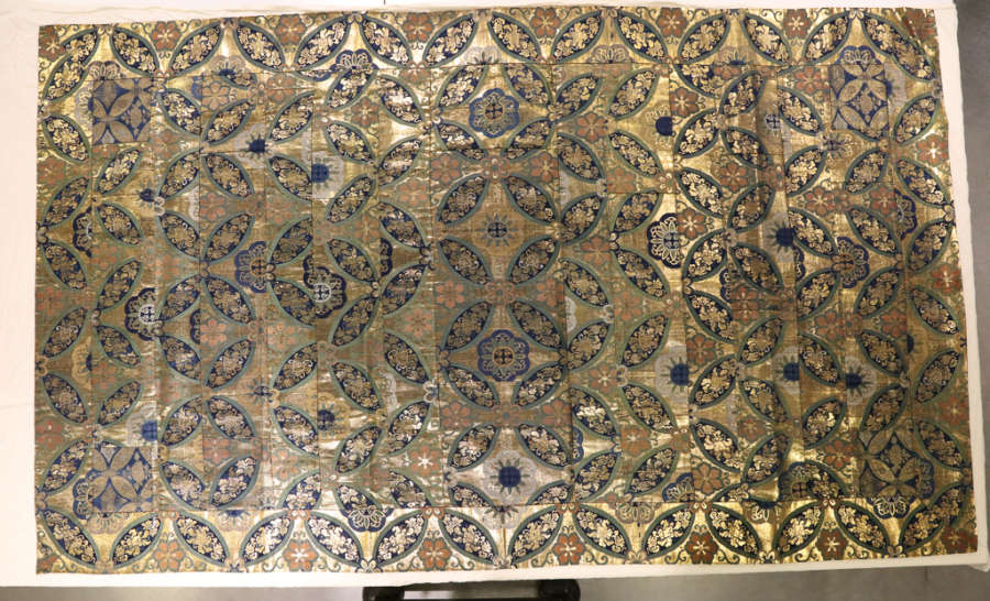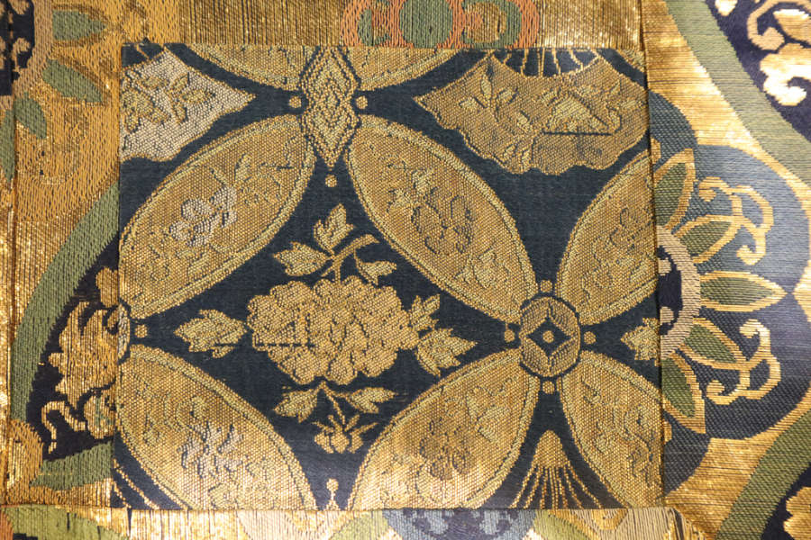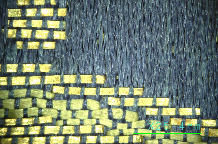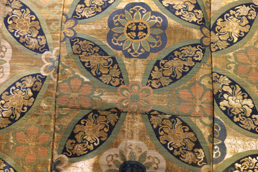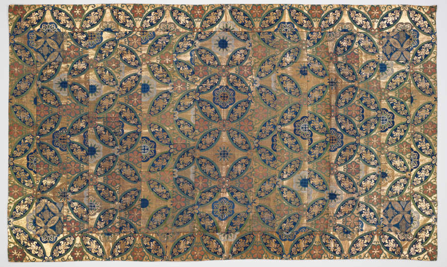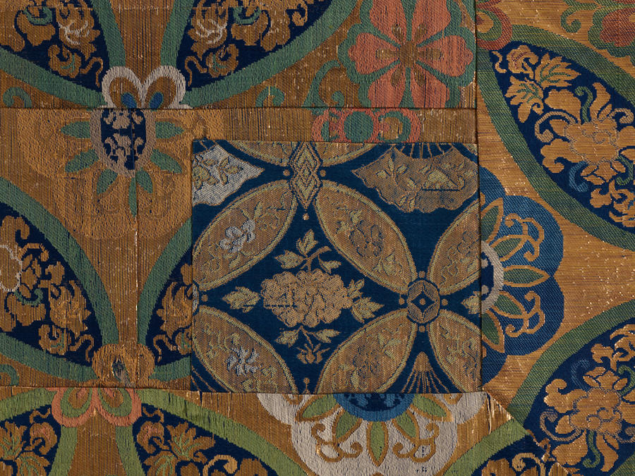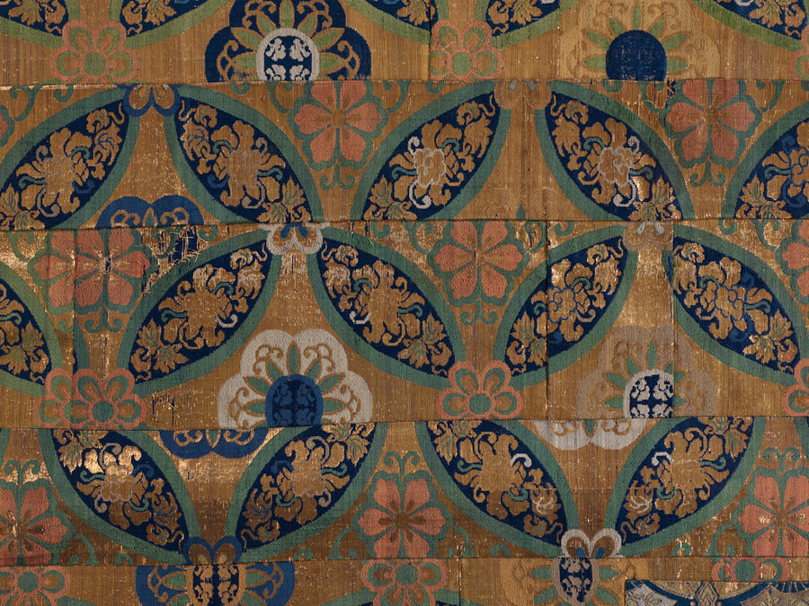 Silk, gilt mulberry paper; compound weave, supplementary weft patterning