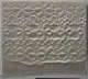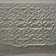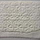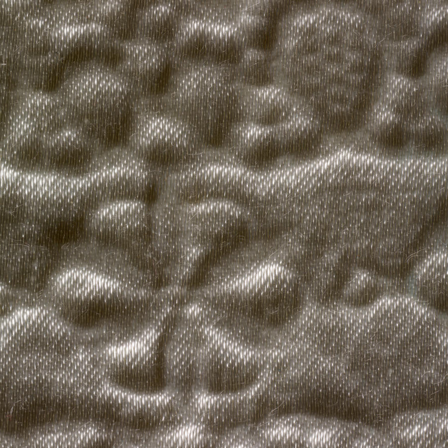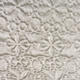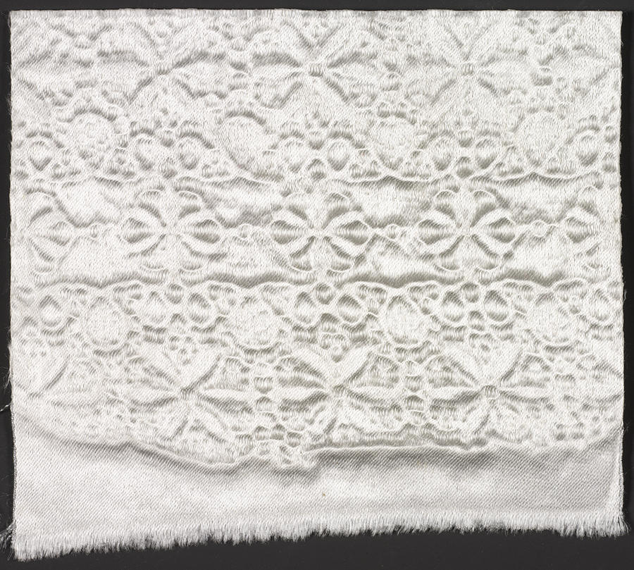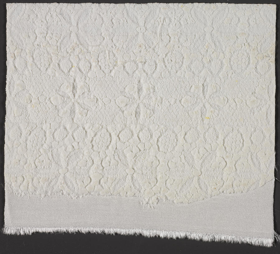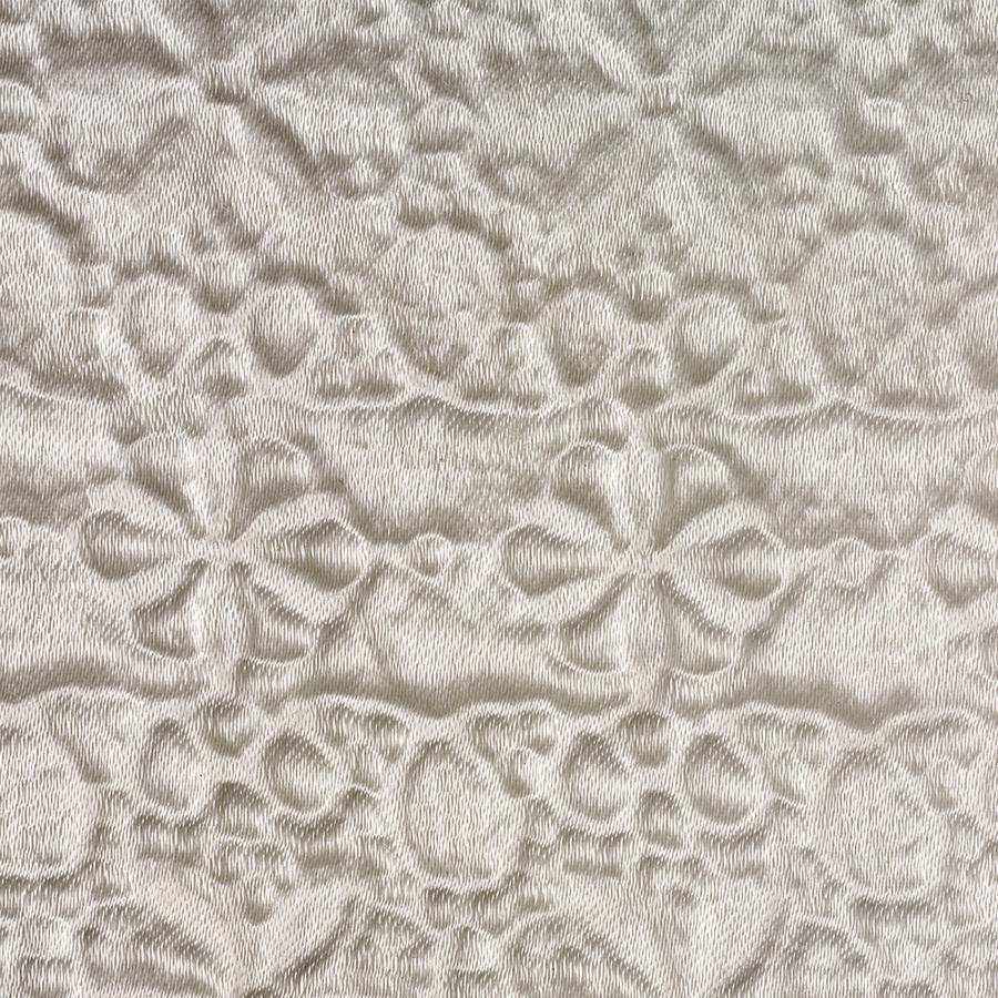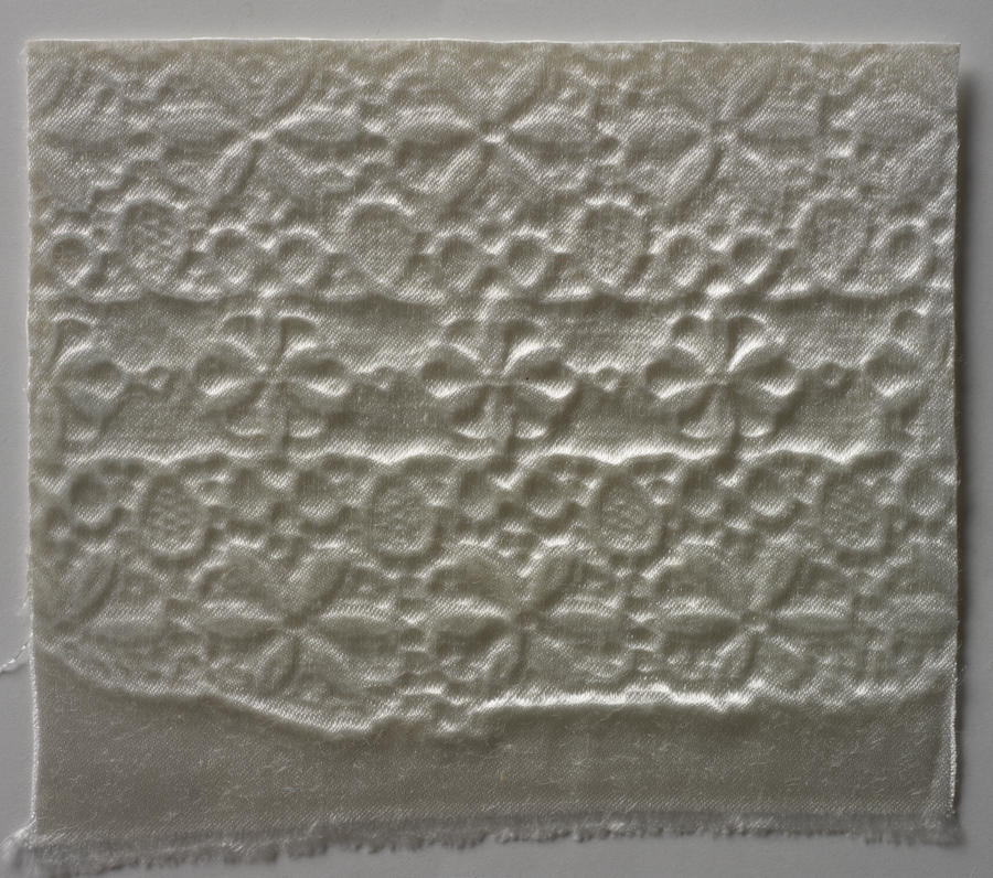 satin face with spandex foam backing pressed through lace stencil used to create embossed lace effect on face