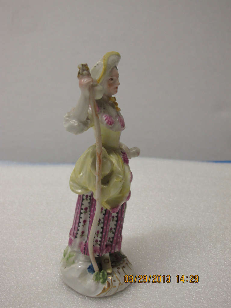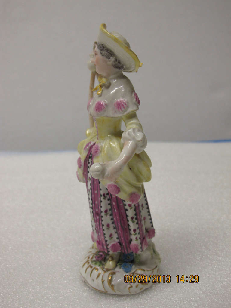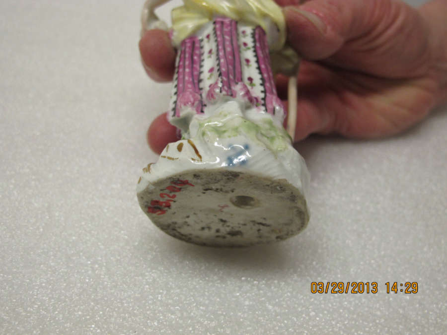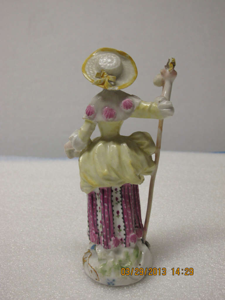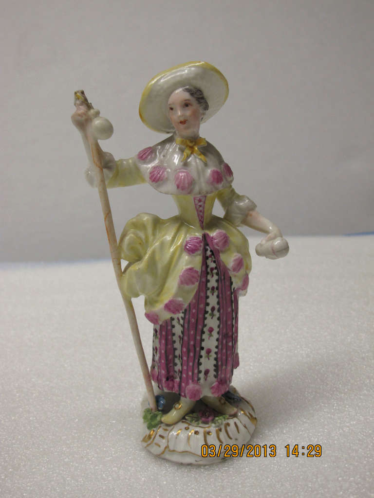 Marks: Blue crossed swords in underglaze at bottom of base. Painters mark "R." in puce