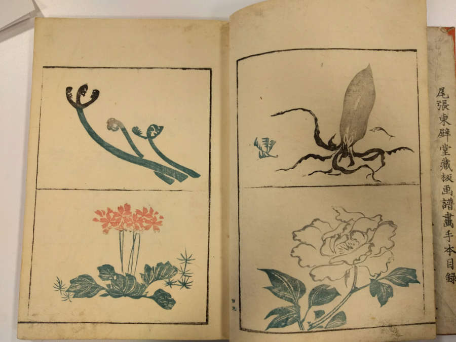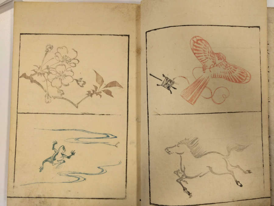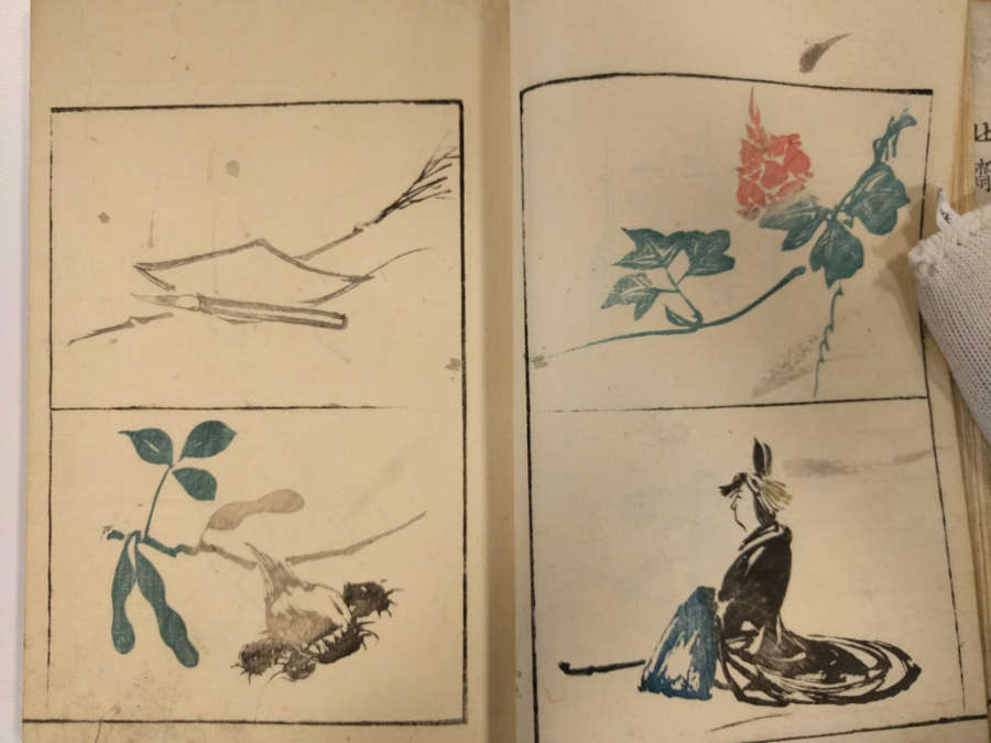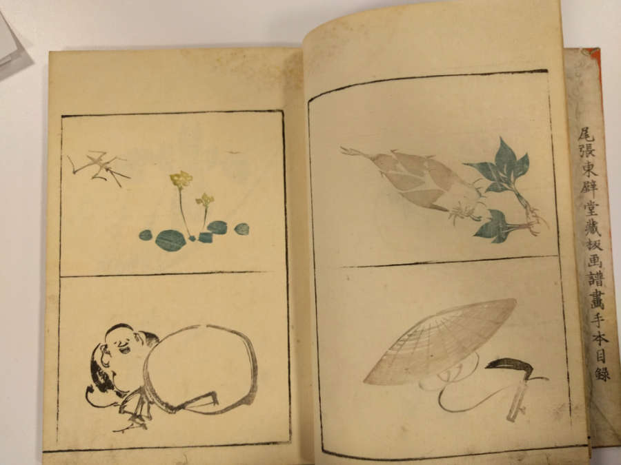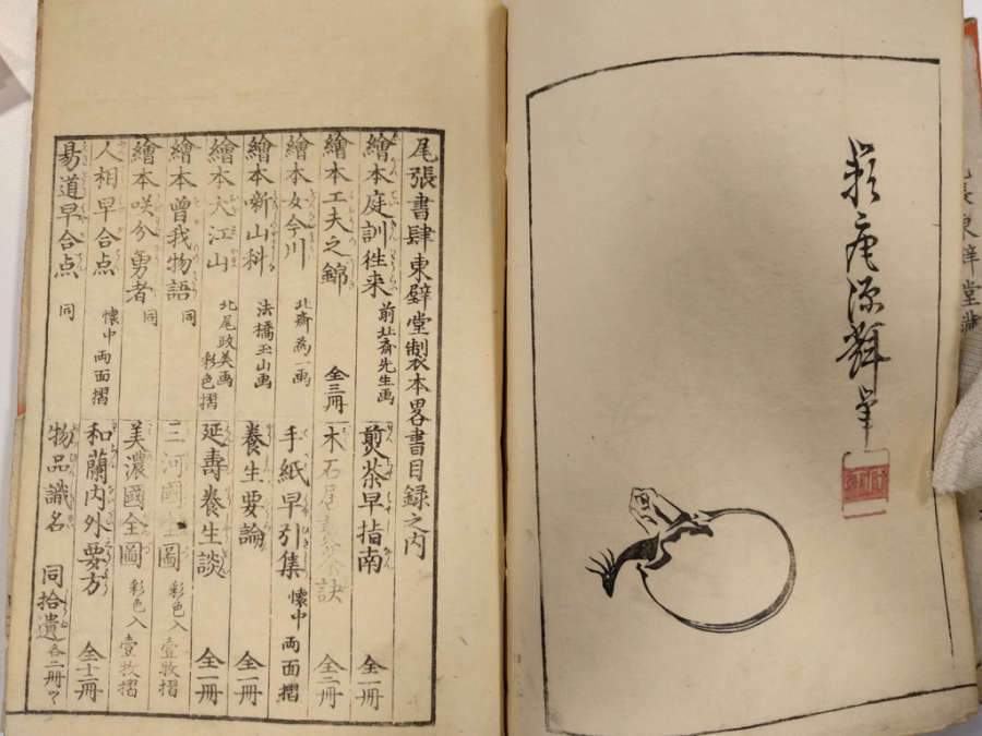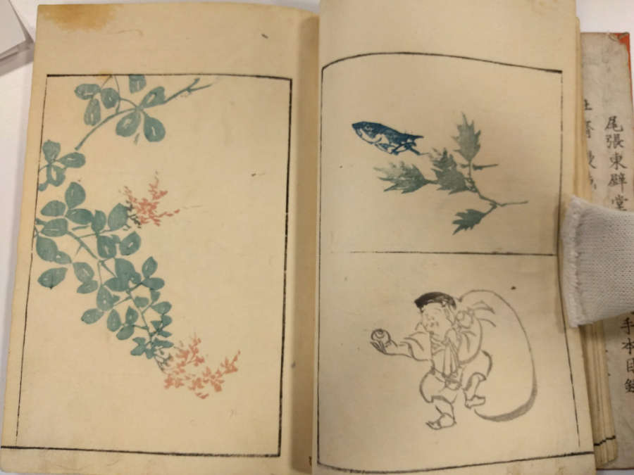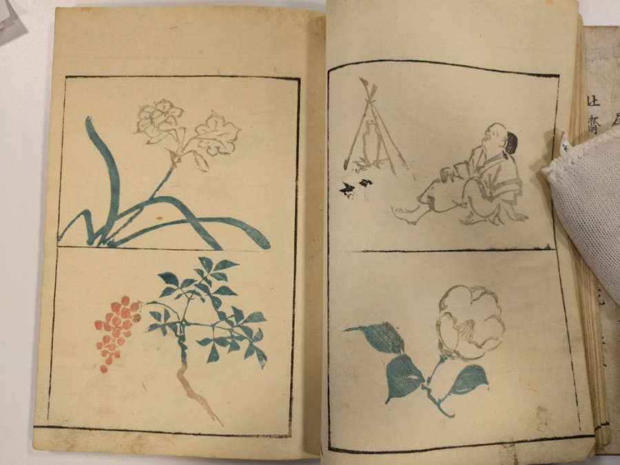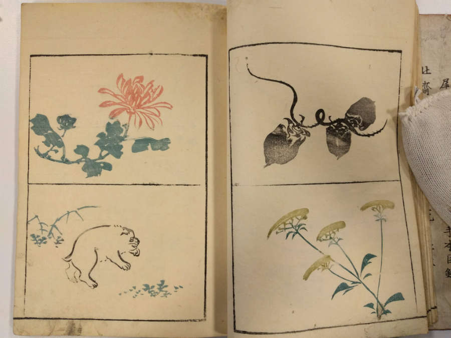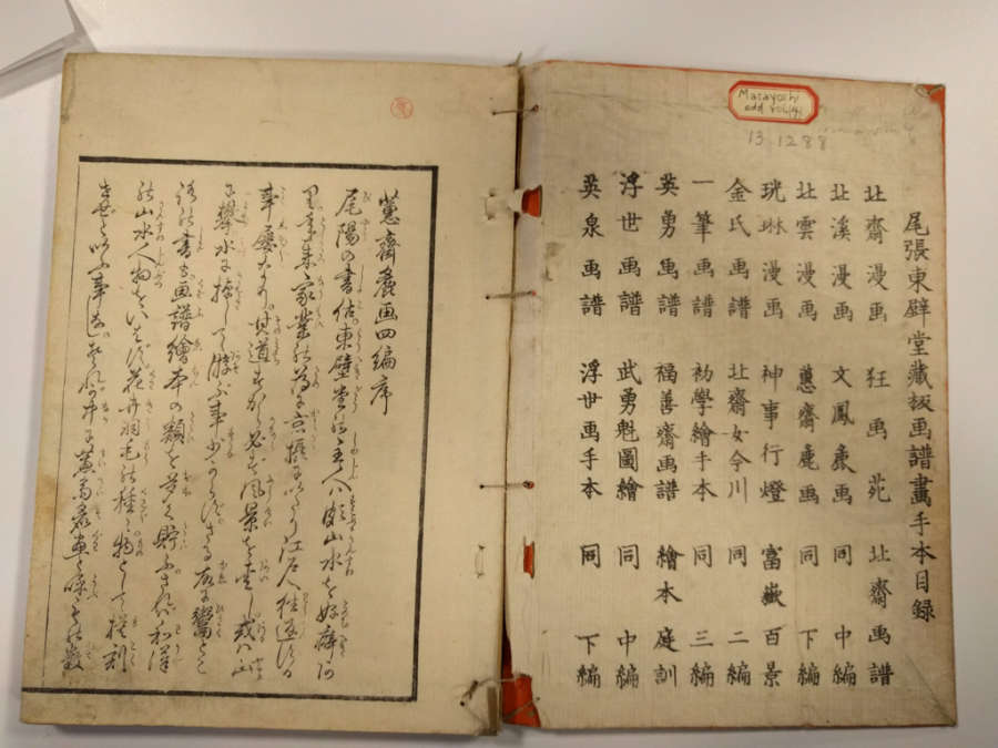 Inscription on inside of front cover, top right in pencil: Masayoshi 4/13.1288Red circular seal stamped on first page, top right; red square seal stamped on last page with image.Octagonal label adhered to inside of front cover, top right corner with inscription in ink:Masayoshi/odd vol. (4); second octagonal label on back cover, top right corner, with inscription in ink: dy/35/Drawing/Masayoshi/13.1288; rectangular label directly below second label with inscription in ink: A/E783