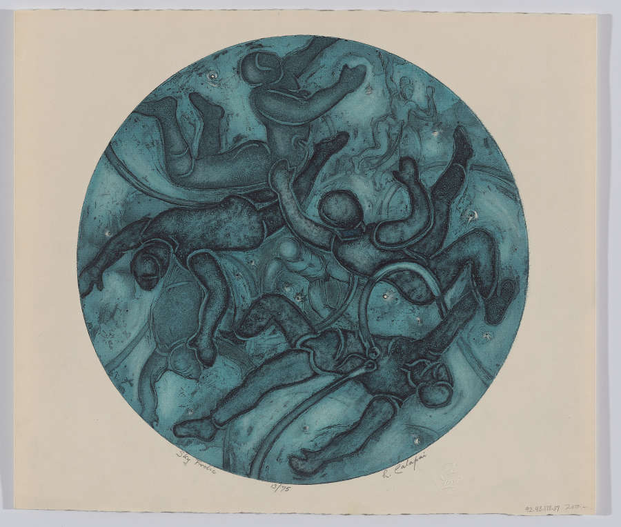 Inscription: On recto in graphite along bottom of circular image “Sky Frolic 13/75 L. Calapai [signed]