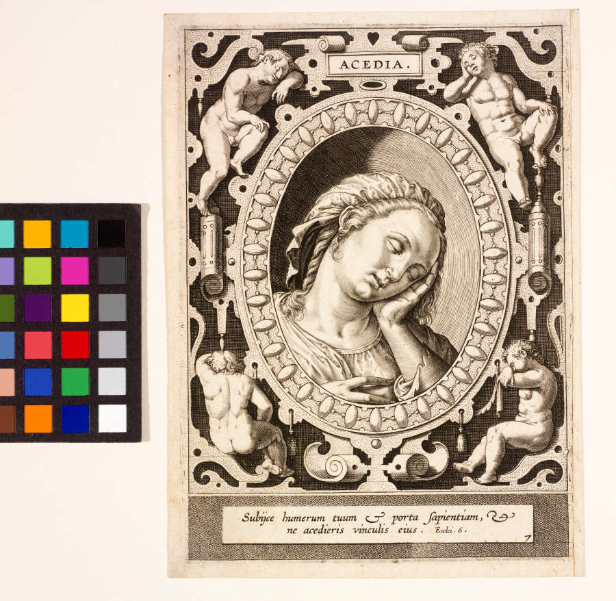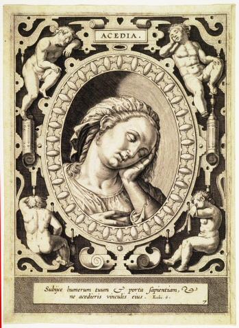 In Plate--Titled, UC:ACEDIA. ; inscribed, LC:Subijce humerum tuum, & porta sapientam, &/ne acedieris vinculis eius . Ecclci.6 ; numbered, LR corner . 7