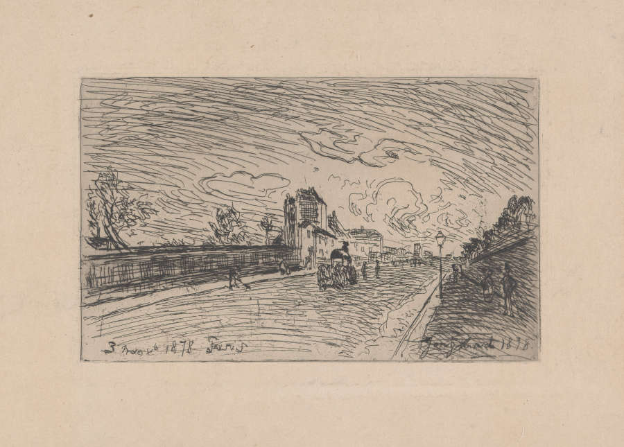 Original--Recto:in pencil in UL:(illegible); in LL:72; in LL of mount:Etching by Jongkind; in LR of mount:1500In plate--Dated and LL:3 NOVb 1878 Paris; sigfned and dated in LR:Jongkind 1878