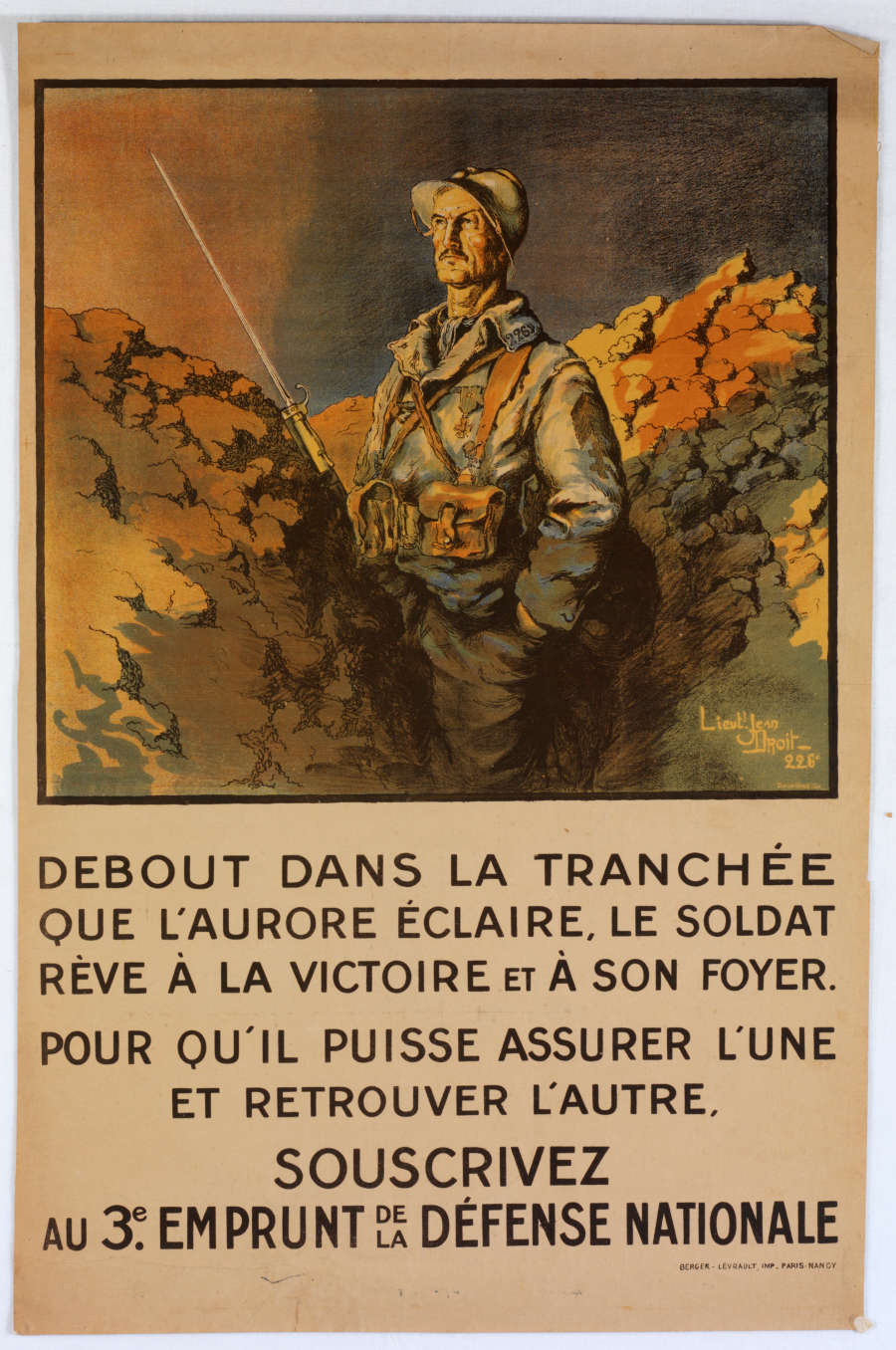 signed in stone LR quadrant: Lieut. Jean/ Droit-/226e/Devambez Gr. ; title lithographed in bottom portion of image: DEBOUT DANS LA TRANCHÉE/ QUE L'AURORE ÉCLAIRE, LE SOLDAT/ RÈVE À LA VICTOIRE ET À SON FOYER./ POUR QU'IL PUISSE ASSURER L'UNE/ ET RETROUVER L'AUTRE,/SOUSCRIVEZ/ AU 3e. EMPRUNT DE LA DÉFENSE NATIONALE; printer name lithographed in LR corner: BERGER-LEVAULT, IMP. PARIS-NANCY