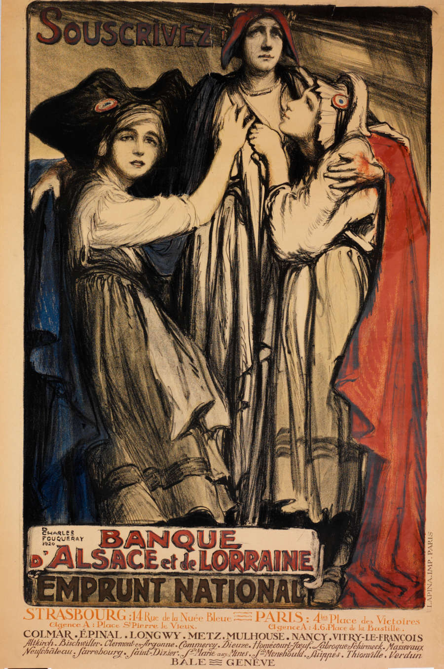 Signed and dated in LL of image: "D/ CHARLES/ FOUQUERAY/ 1920"; inscribed in UL corner of image: "Souscriez!"; inscribed in LL of image: "BANQUE/ D' ALSACE et deLORRAINE/ EMPRUNT NATIONAL"; printer's name inscribed in LR margin: "LAPINA. IMP. PARIS"; extensive information inscribed in L margin