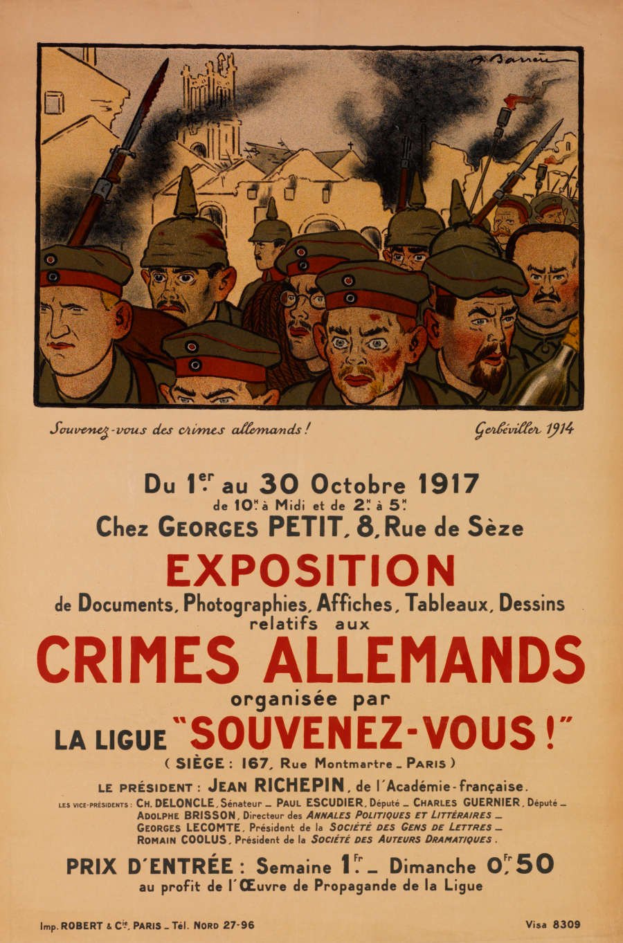 Artist name inscribed in stone UR corner: "A. Barrere"; inscribed in mid-right region: "Souvenez-vous des crimes allemands!" ; printed on mid-left edge: "Gerbéviller 1914"; printed in center bottom: "Du 1er au 30 Octobre 1917/ de 10h. à Midi et de 2h. à 5h. / Chez Georges PETIT, 8, Rue de Sèze / EXPOSITION / de Documents, Photographies, Affiches, Tableaux, Dessins / rélatifs aux / CRIMES ALLEMANDS / [...]" ; printer name inscribed on LL edge: "Imp. ROBERT & Cie, PARIS_Tél. NORD 27-96"; printed on LR: "Visa 8309"