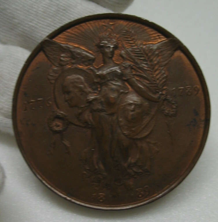 Obverse: "1776 / 1789 / 1889" Reverse: "REPUBILQUES CENTENAIRES / SALUT / TO ALL MEN, OUR BRETHEREN / A TOUS LES HOMMES NOS FRERES / 1889 / PROGRES / LABEUR"