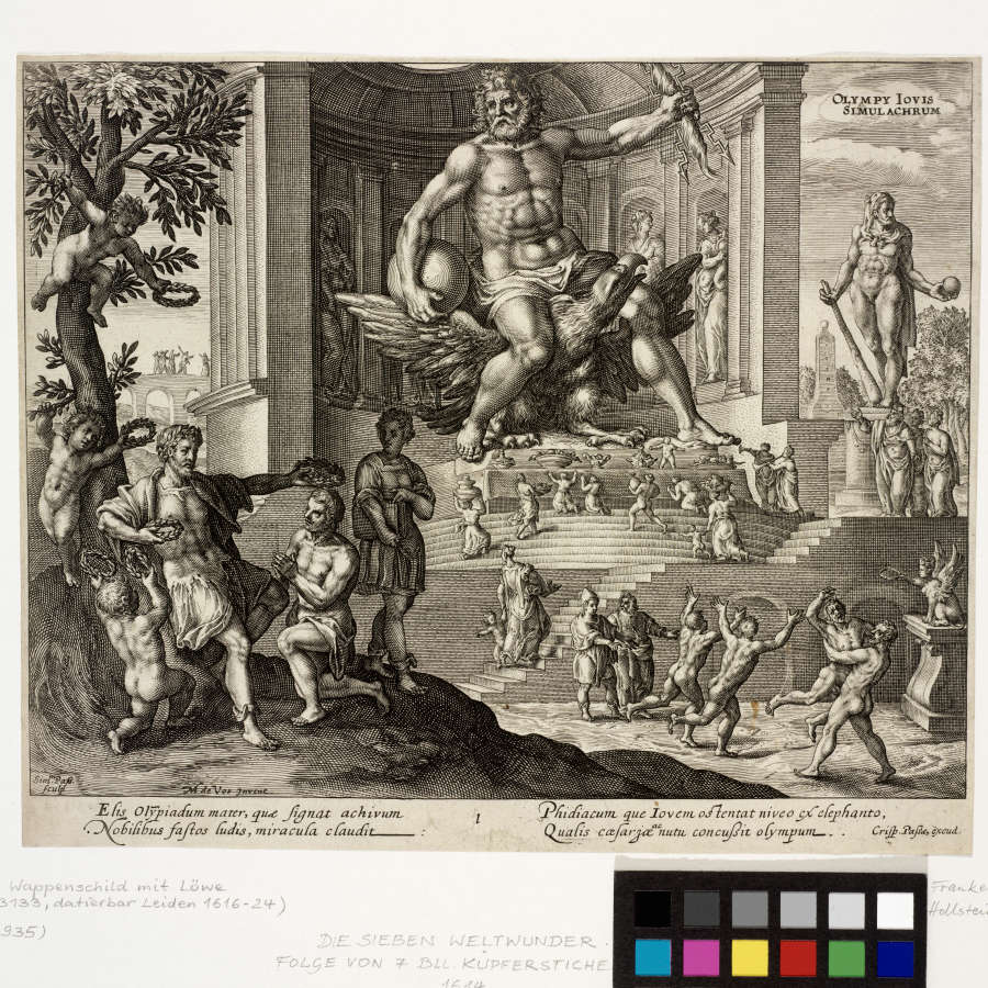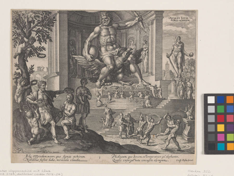 Printed, on image, UR:Olympy Iovis Simulachrum; Printed, on image, LL: Simon. Pab sculp/ M de Vos Invent; Printed, on print, LR: Crisp. Pabae, excud; Printed, on print, LL to LR: Elis Olypiadum... concubit olympum.