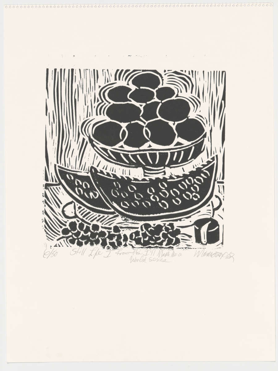 In pencil on recto under image: "6/50 Still Life I from the I'll Make Me a / World Series"; signed in LRC below image