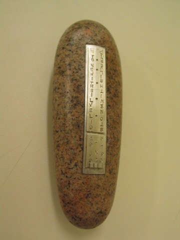 Silver lid in two (2) portions. Longer, fixed, portion engraved twice, in opposite directions: STONE WITH SILVER LID; smaller, removable portion engraved: 19/94 (date manufacturer)/ J x P (John Axel P)