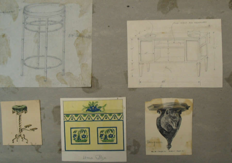The following are all on recto in pencil:On far left panel, "cushion / 4" / 12" / 34" overall / 38.00 R / A" (38.00 referring to $38?). On top right panel (clockwise from upper left): "12" / THIS SHELF FOR MAGAZINES / 10" / 8" / 30" / 48" / 10" / 20" ", (and at center) "12"/ 5" /11" ". Lower right panel: "Marg(?vieve?)". Middle lower panel: "WOOD BOX". Verso of (B)(when seen from the front it is the lower left) in pencil: "B".