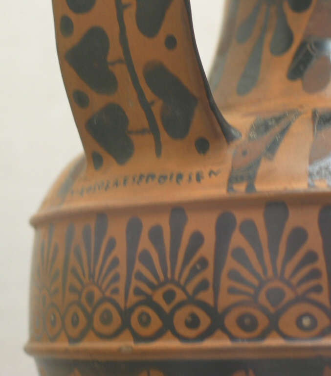 Signed by the Potter Nikosthenes ("Nikosthenes made..." under one of two broad, flat handles)