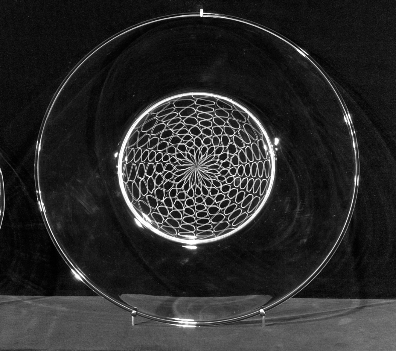 Blown glass (eight plates), fabric covered wooden shelf, framed text; ten parts