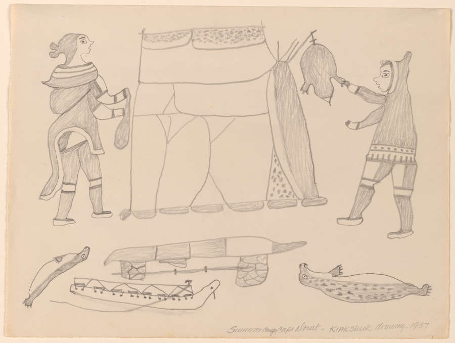 Signed and dated in pencil in LR:Summer Camp, Camp Dorset - KIAKSHUK, drawing 1957Verso:#2)Kiakshuk - Story of a Hunt; COLLECTION JAMES HOUSTON