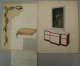 In pencil on recto of right panel (from top left corner clockwise): "(Minic?) / Regular size books / Large books / 3" / Very large books / Very, very large books lying down / 34".In pencil on recto of left panel: "For Mrs. Scho(e?)llko / This is OK but color will have to be changed to go with (?) chintz when found".On recto of loose paper in pencil: "15" / 30" / 15" / 12" deep / 14 or 15" deep / 12" deep / White laq. top with insert of glass in back for light / 12".Red laq. side and front. Adjustable + (?) adjustable".On cardboard recto in pencil: "A / B".