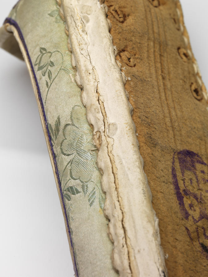 Silk, leather, rubber?; damask weave, appliquéd