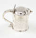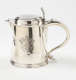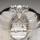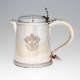 It bears the Ellery coat of arms on the lid and the Sedgwick coat of arms on the opposite side. Later owners added a spout to the front, requiring the flat lid to be bent upward.