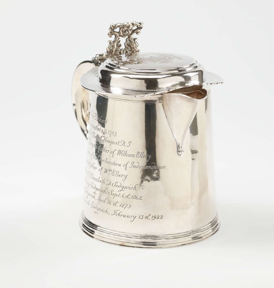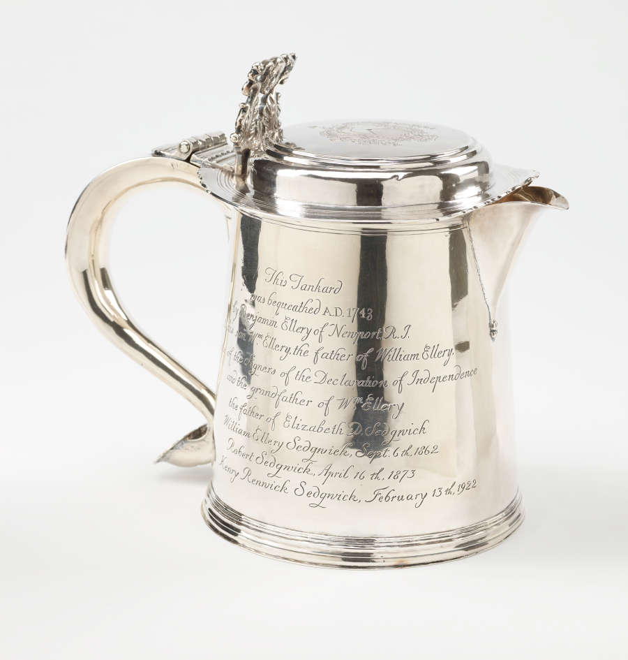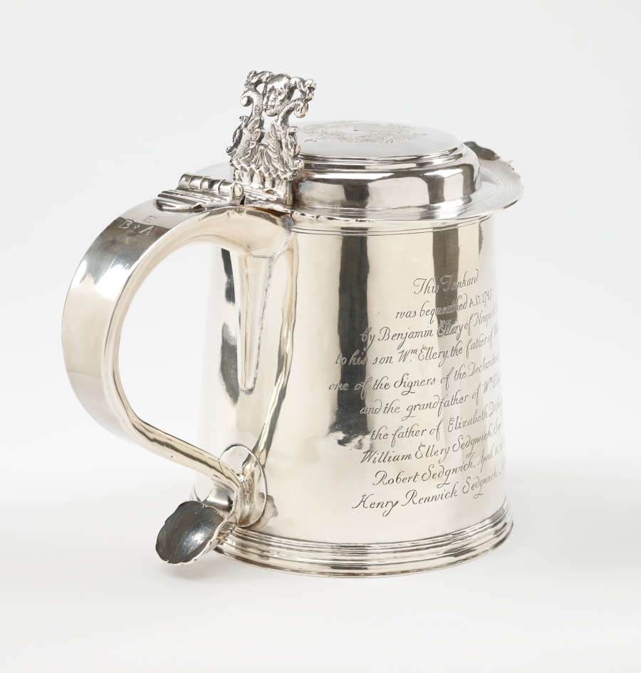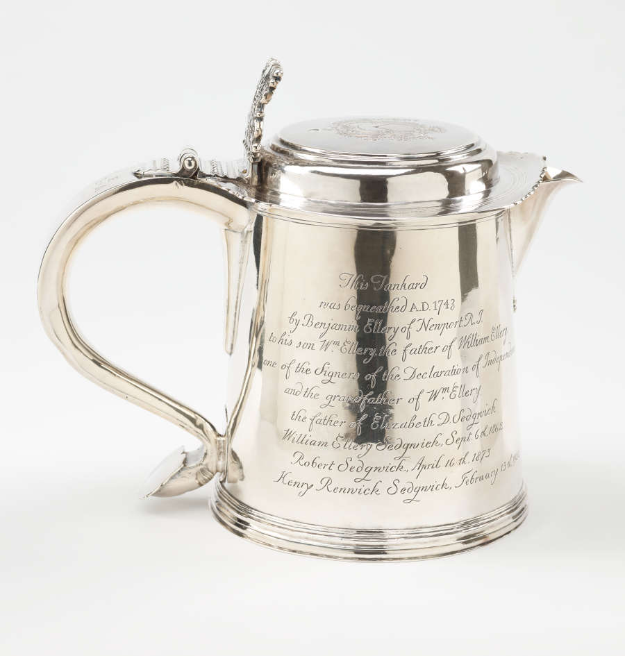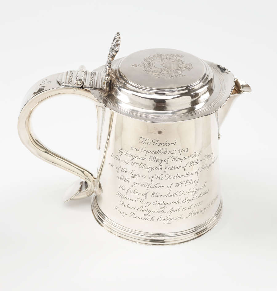 “This tankard / was bequeathed a.d. 1743 / by Benjamin Ellery of Newport, r.i. / to his son Wm. Ellery, the father of William Ellery, / one of the Signers of the Declaration of Independence / and the grandfather of Wm. Ellery / the father of Elizabeth D. Sedgwick / William Ellery Sedgwick, Sept. 6th, 1862 / Robert Sedgwick, April 16th, 1873 / Henry Renwick Sedgewick, February 13th, 1922.”