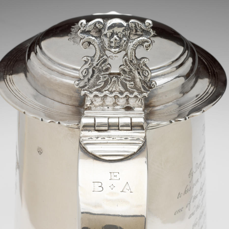 This unusually large tankard bears lengthy inscriptions indicating its significance as an heirloom of the Ellery family of Newport beginning in the eighteenth century and continuing through the twentieth century: