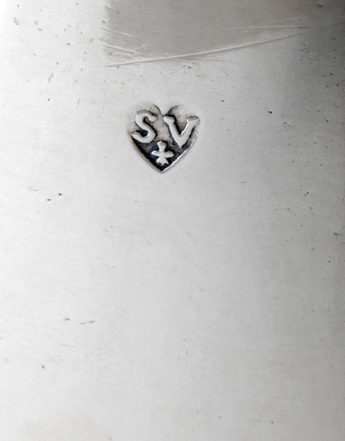 This tankard was made probably about / 1730 by Samuel Vernon in Newport, / Rhode Island, one of the most distinguished silversmiths of that period / For arms see Papworth, edit. 1874, p. 342 / Ellery: par chev. arg. and az. a bordure / engrailed or. (Eldres or Eleris) / Sedgwick: p. 650. or on cross gu five / bells arg. (Sedgwick, Dent, co. York) / .
