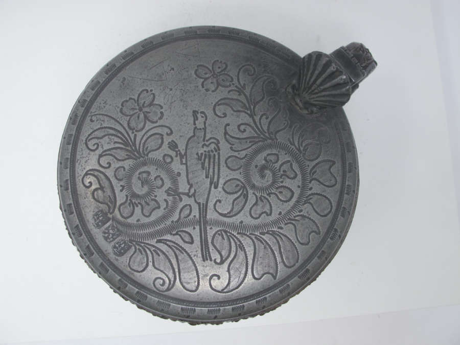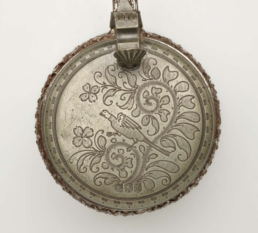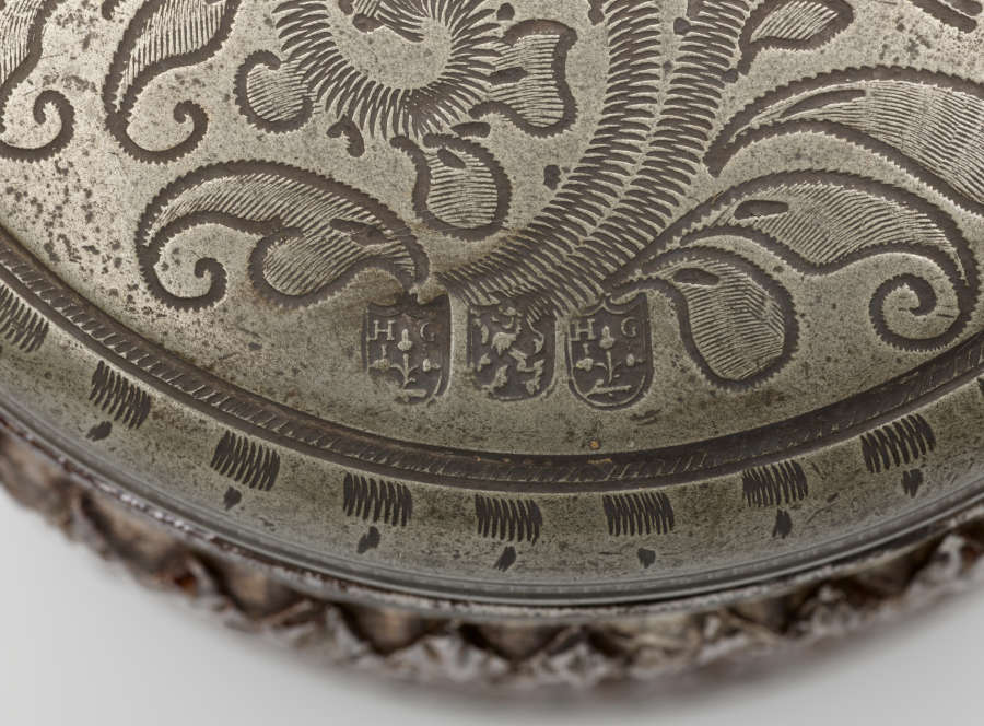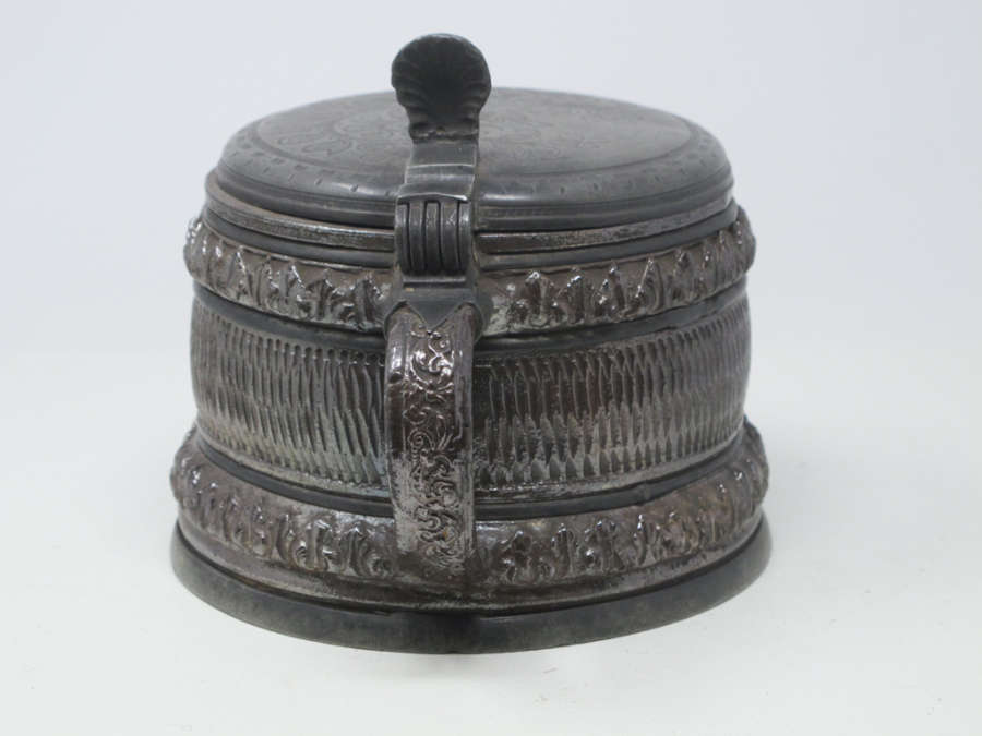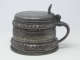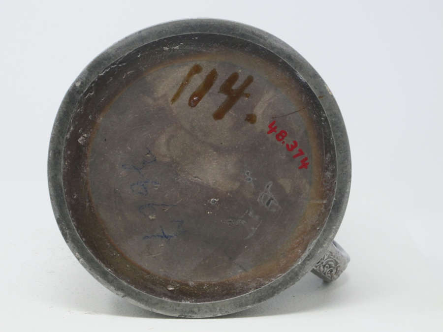 Marks: Lid:engraved bird in plant; at foot of plant, two marks one repeated.Shield containg rampant lion (hallmark of town) between two imprints of shield containing plant with three acornsand H. G. Thumb piece in shape of shell.Large lump of clay in bottom towards handle.114 written in glaze on bottom.