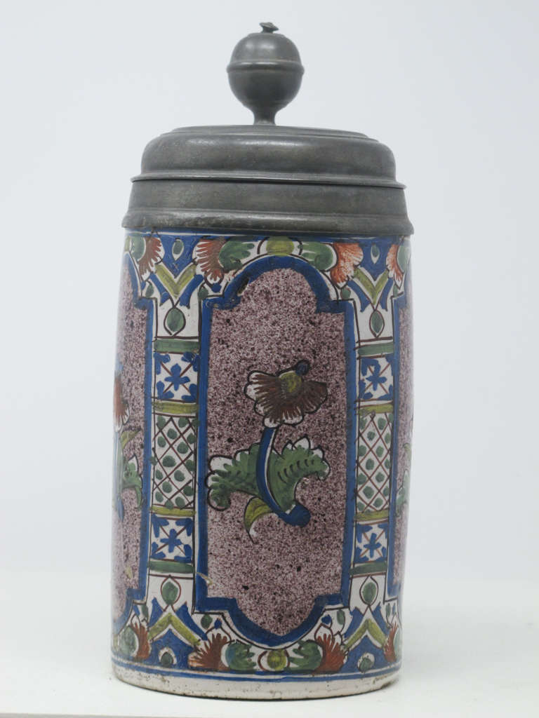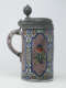 Tin-glazed earthenware, enamel decoration, pewter mounts