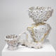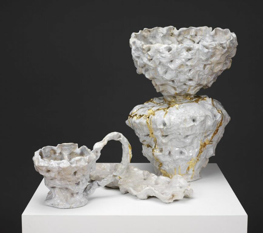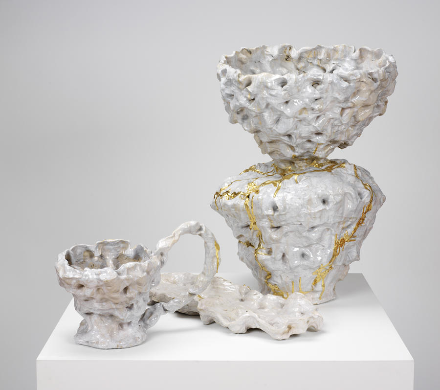 Glazed ceramic, epoxy, gold leaf, and India ink