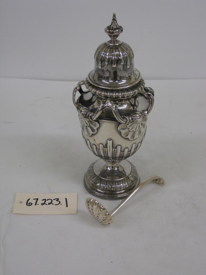 Label: Cloth tape labels on underside of base, inside lip of cover, and back of ladle handles marked 67.223.1a, b, c; 67.233.2a, b, c; 67.223.3a, b, c, respectively.