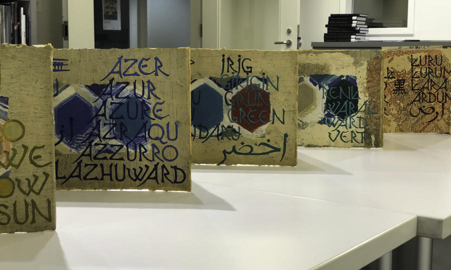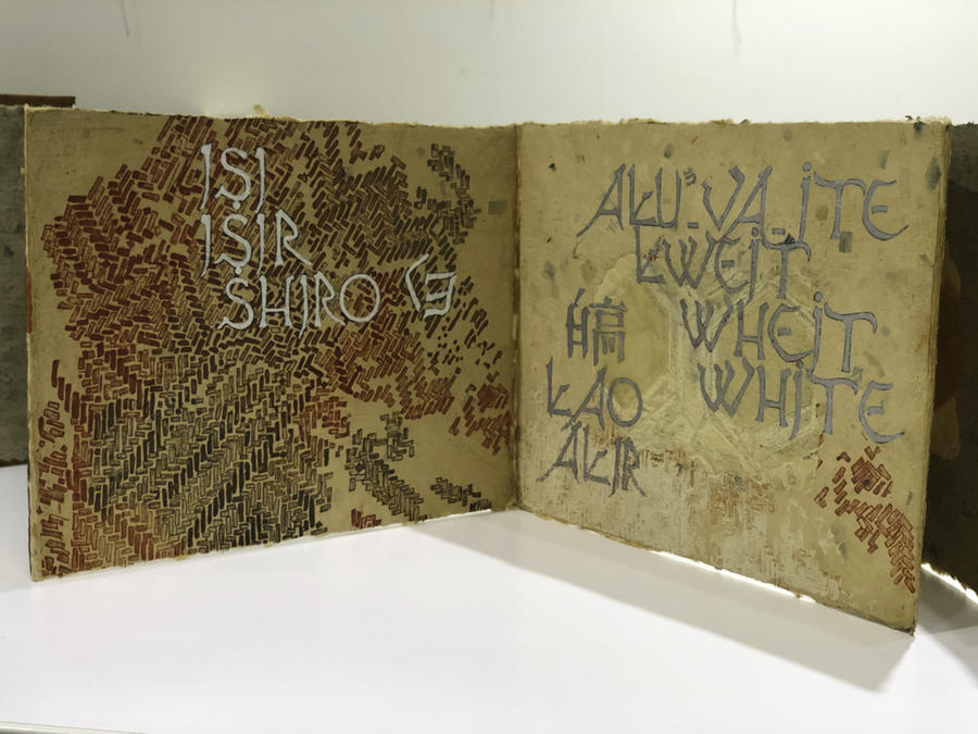 Accordion-fold book; mixed media with etching, hand-coloring, and leather binding