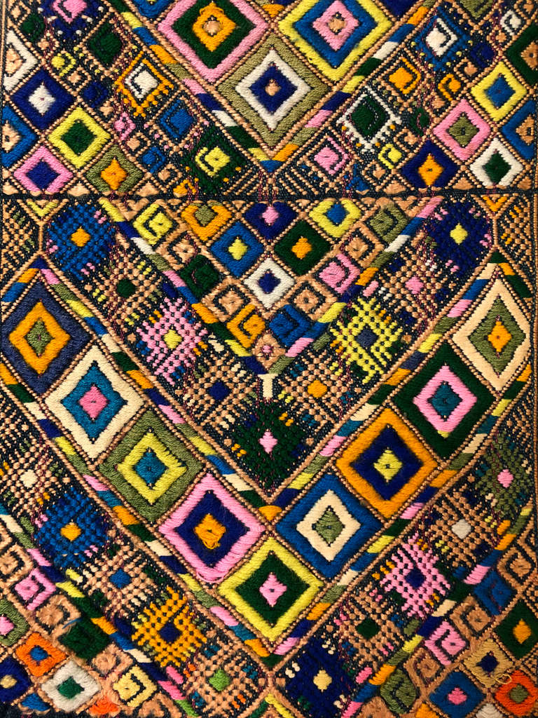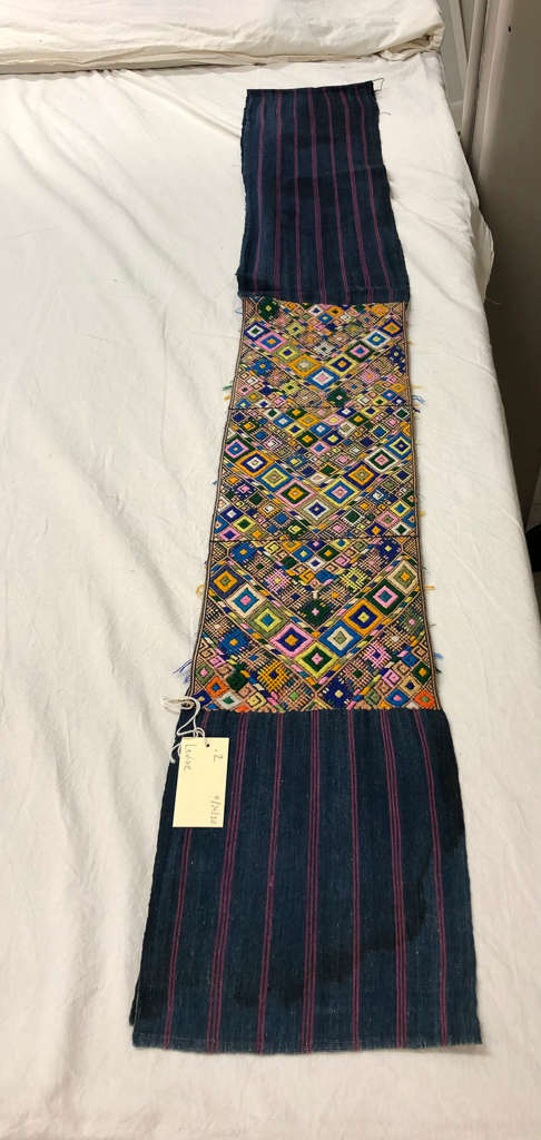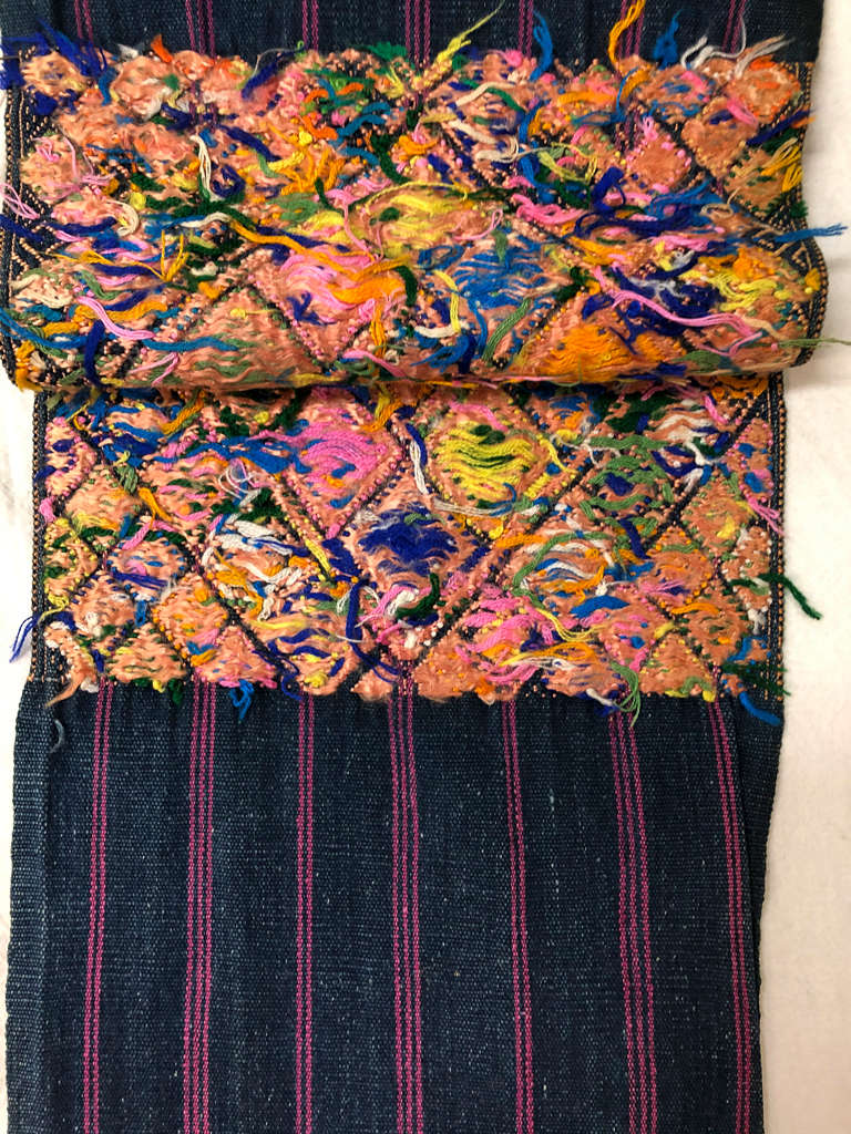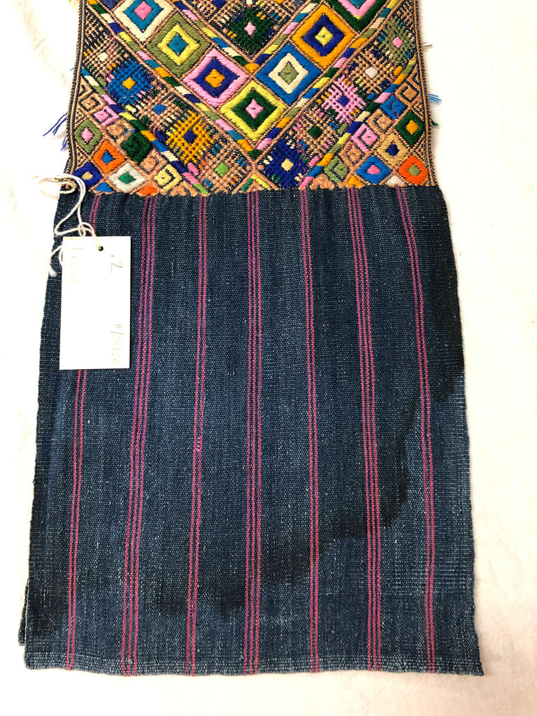 Cotton, warp striped, with supplementary weft decoration. Indigo dye.