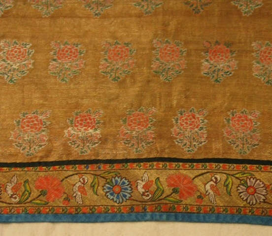 Compound woven with supplementary-weft patterning, silk and wrapped metallic silk threads