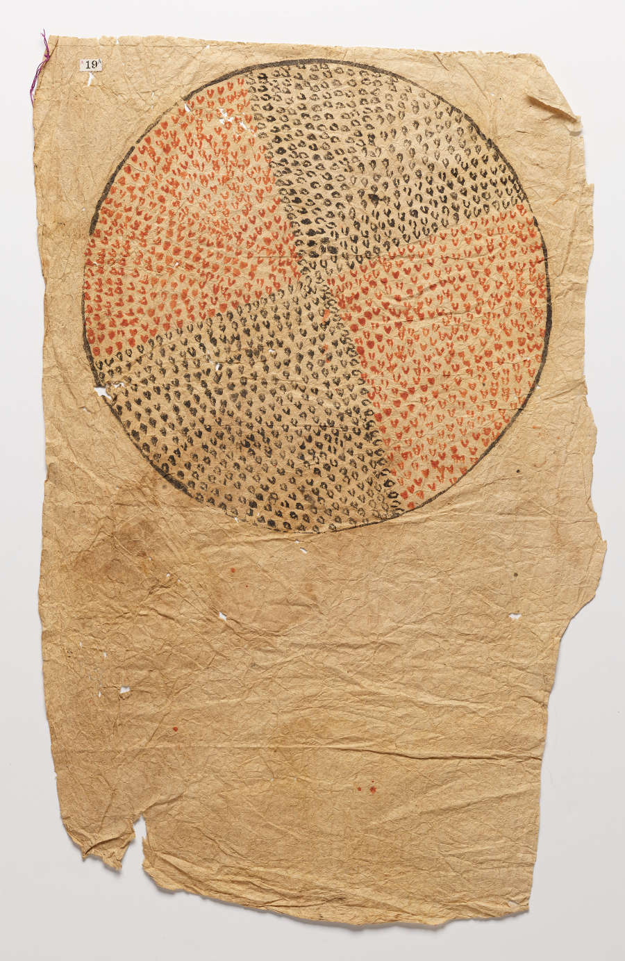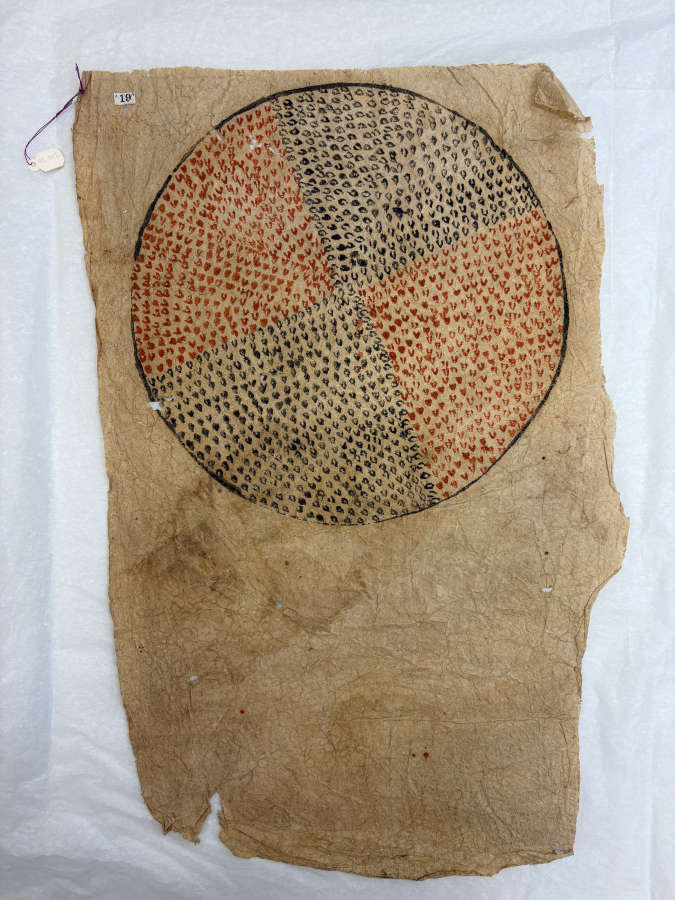 Beaten and fermented bark fiber, stamping and freehand painting