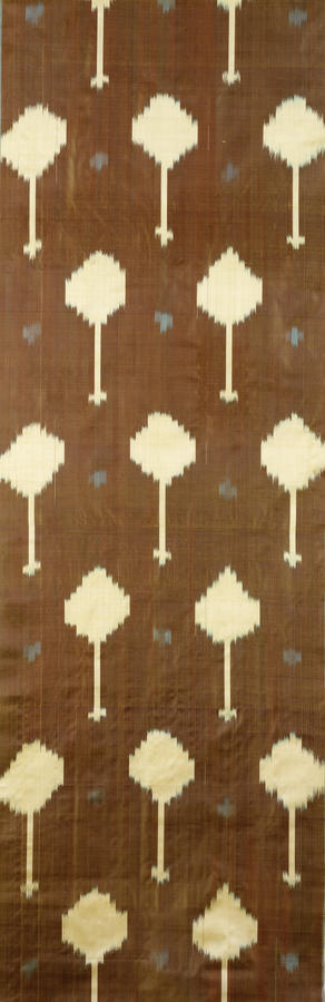 The father and son dyer/weaver team whose work is seen here came to Bukhara for the Silk & Spice Festival from the town of Andijan, in the Fergana Valley in eastern Uzbekistan. In addition to their solid color and iridescent silk textiles, they have also experimented with new patterning for their ikat-dyed fabrics.