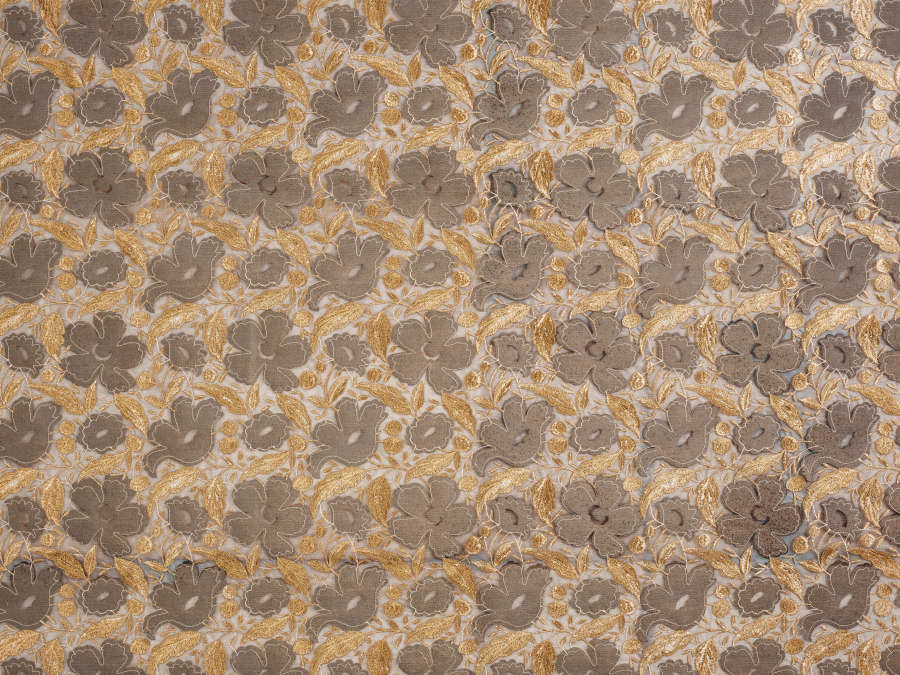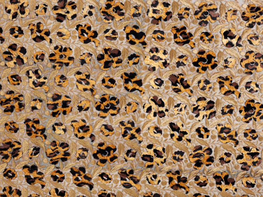 Synthetic plain weave with metallic-wrapped yarn machine embroidery and faux fur applique