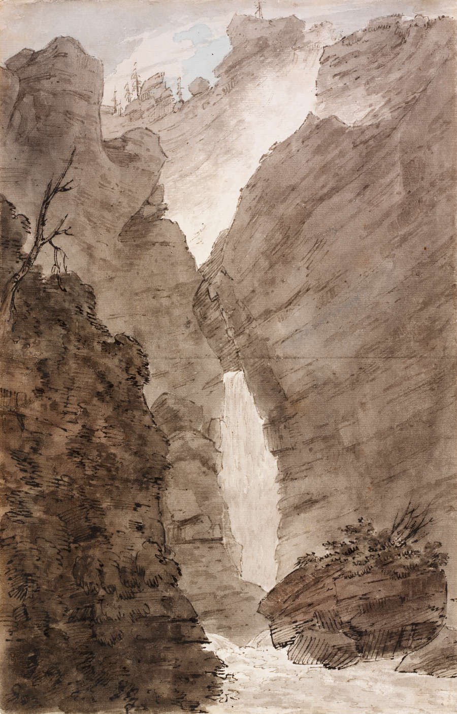 Ink washes applied with brush, ink and pen, watercolor, and graphite