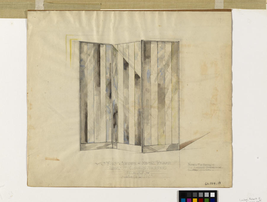 in pencil, near lower edge of sheet- "3 fold screen and metal frame. panels of clear & mirrored glass. scale 1 1/2" - 1'. Note: the backs of the mirrored strips are to be painted silver."