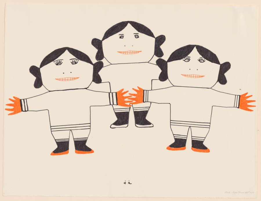 Signed and dated in pencil, LR:Anna, Cape DorsetN.W.T. 1968 ;in ink, LC:(a triangular shape followed by a C shape, each surmounted by a dot). Cape Dorset blind stamp in LL corner.