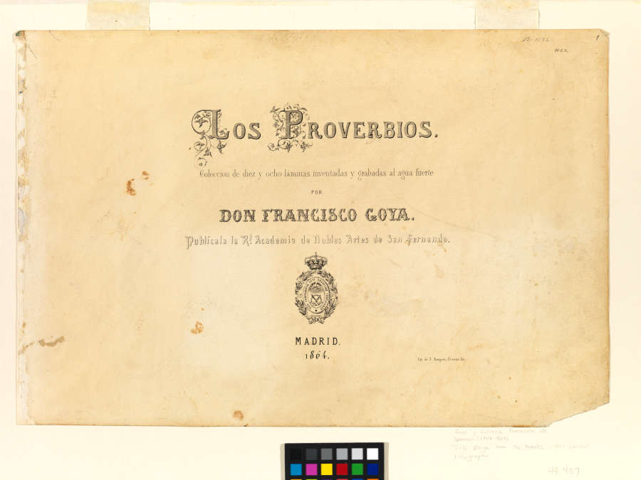 Lettered: "Los Proverbios / Coleccion de diez y ocho laminas inventadas y grabadas al agua fuerte / por / Don Francisco Goya / Publicala la R.l Academia de Nobles Artes de San Fernando. / Madrid / 1864"