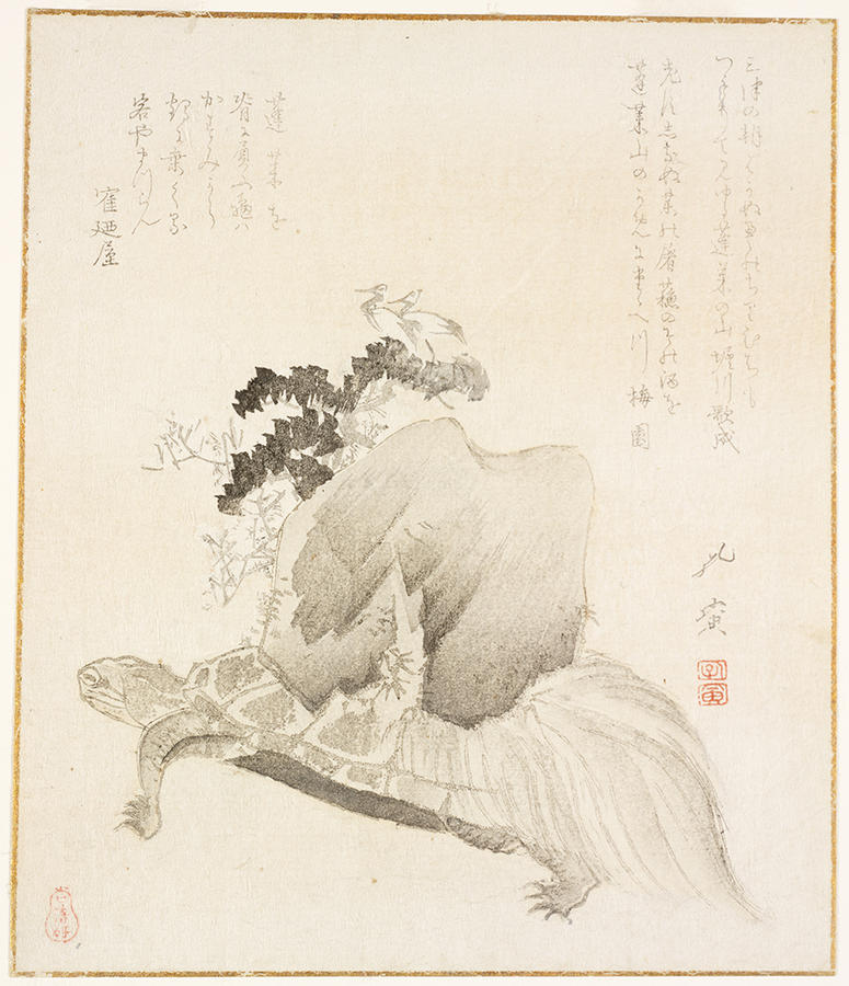 - 梅園蓬莱を背に負ふ亀はかすみから鶴に乗くる客やまつらん