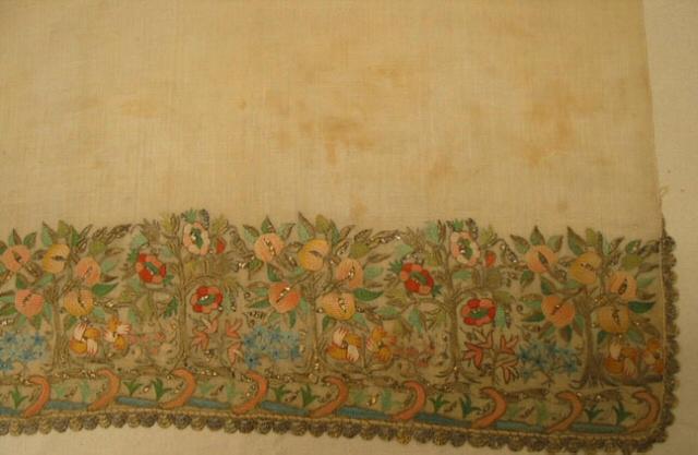 Cotton, silk, metallic yarns; plain weave, needle lace, embroidery (double running stitch, satin stitch)