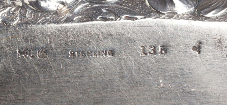 Gorham makers marks, "STERLING" and bird date stamp for 1890