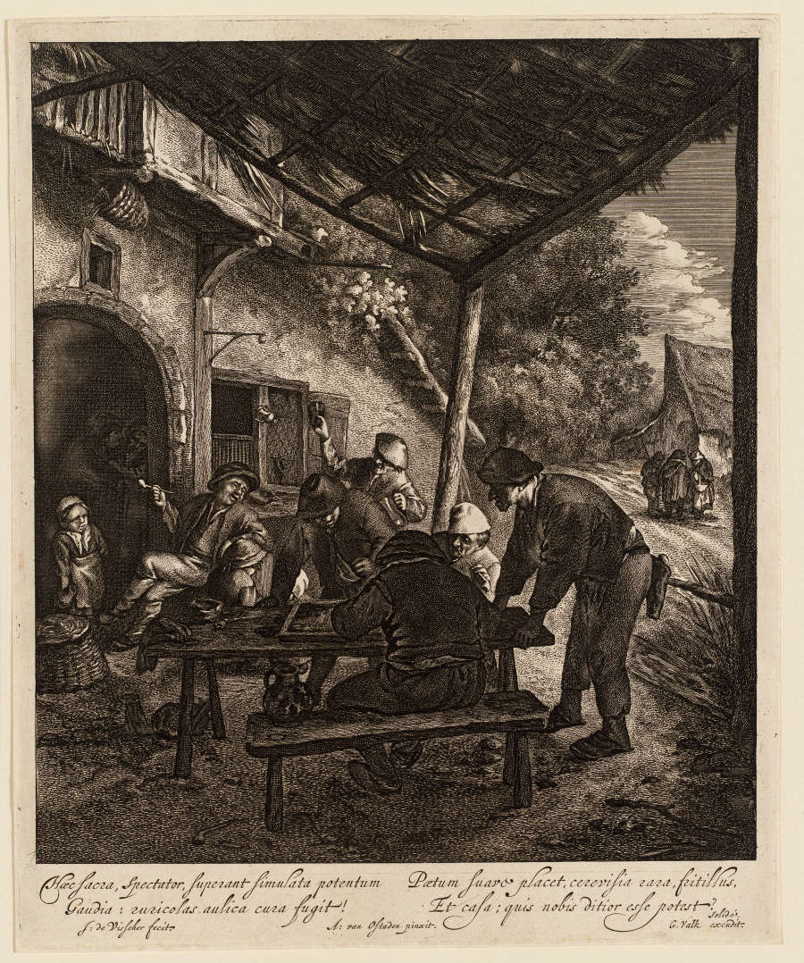 In Plate-- four line latin inscription in LC:Haec Sacra, spectator, superant simulata, potentum...(see print); inscribed along bottom edge:J: de Visscher fecit. A:van Ostade pinxit. G. Valk excudit