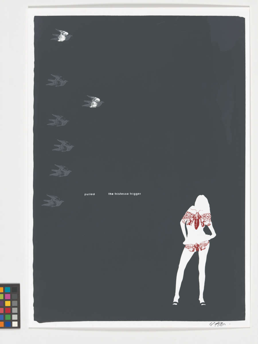 In black ink in LRC of recto: artist's signature; Printed in white in image "pulled the tristessa trigger"